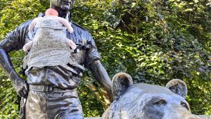 No one is trying to feed a baby to a bear, but today in Edinburgh, the famous Wojtek the Solider Bear statue is carrying a baby in a sling.