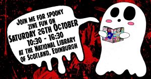 Attendees can purchase zines and participate in a crafting table with Halloween-themed collage materials to create their own zines.